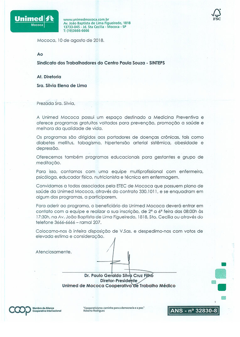 Para incluí-lo no próximo mês, o Departamento de Convênios do Sinteps deverá receber sua documentação até o dia 10 do mês anterior. Para a inclusão é necessário enviar a Ficha de Cadastro, o Termo de Compromisso e a Declaração de Saúde preenchidos e assinados, bem como anexar os documentos necessários.