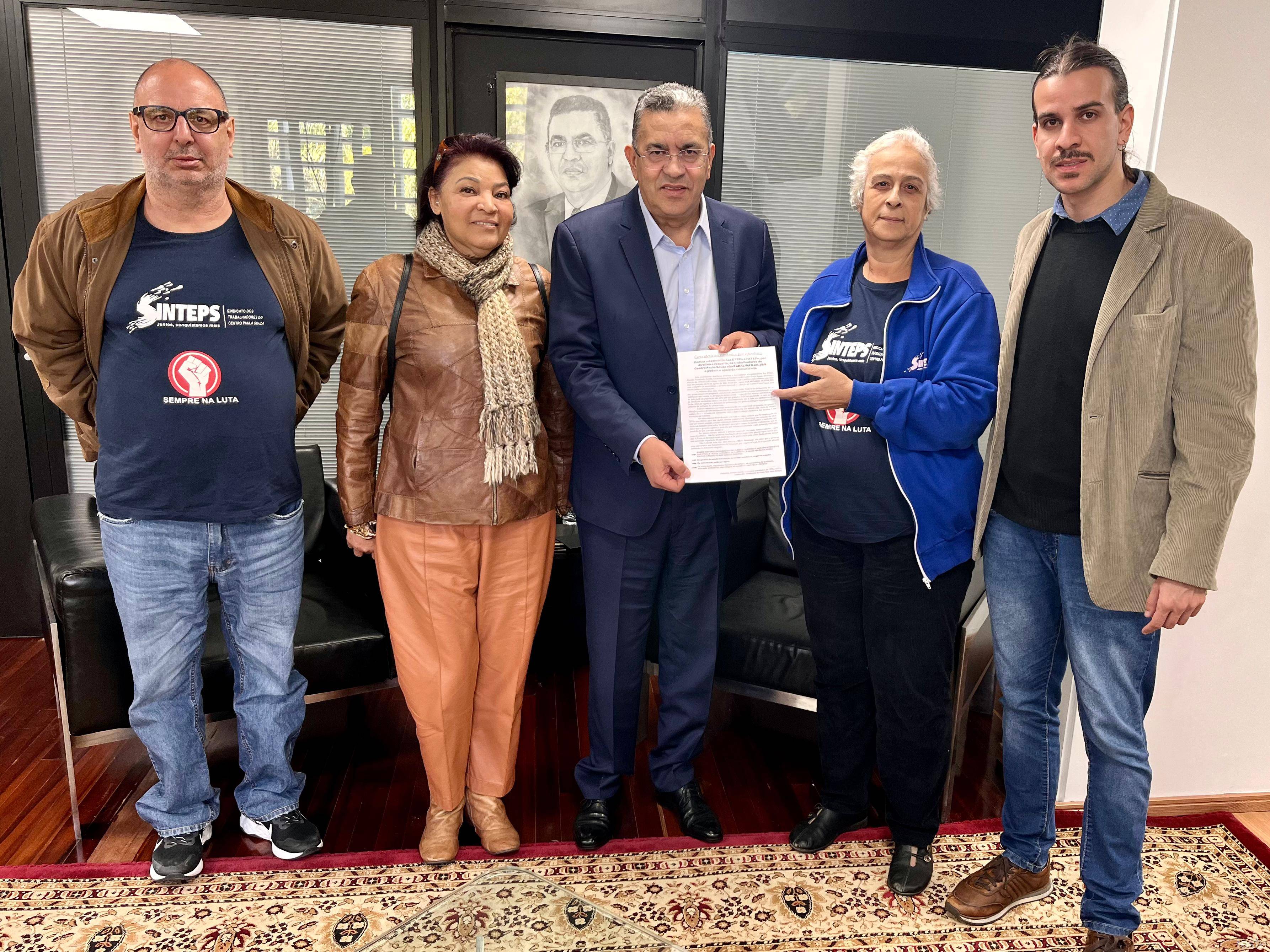 Diretores do Sinteps estiveram na Assembleia Legislativa nesta segunda, 26/8/2024. Eles conversaram com o líder do governo e vice-presidente da Alesp, deputado Gilmaci Santos, defenderam as reivindicações da categoria e falaram do andamento de projetos na casa.