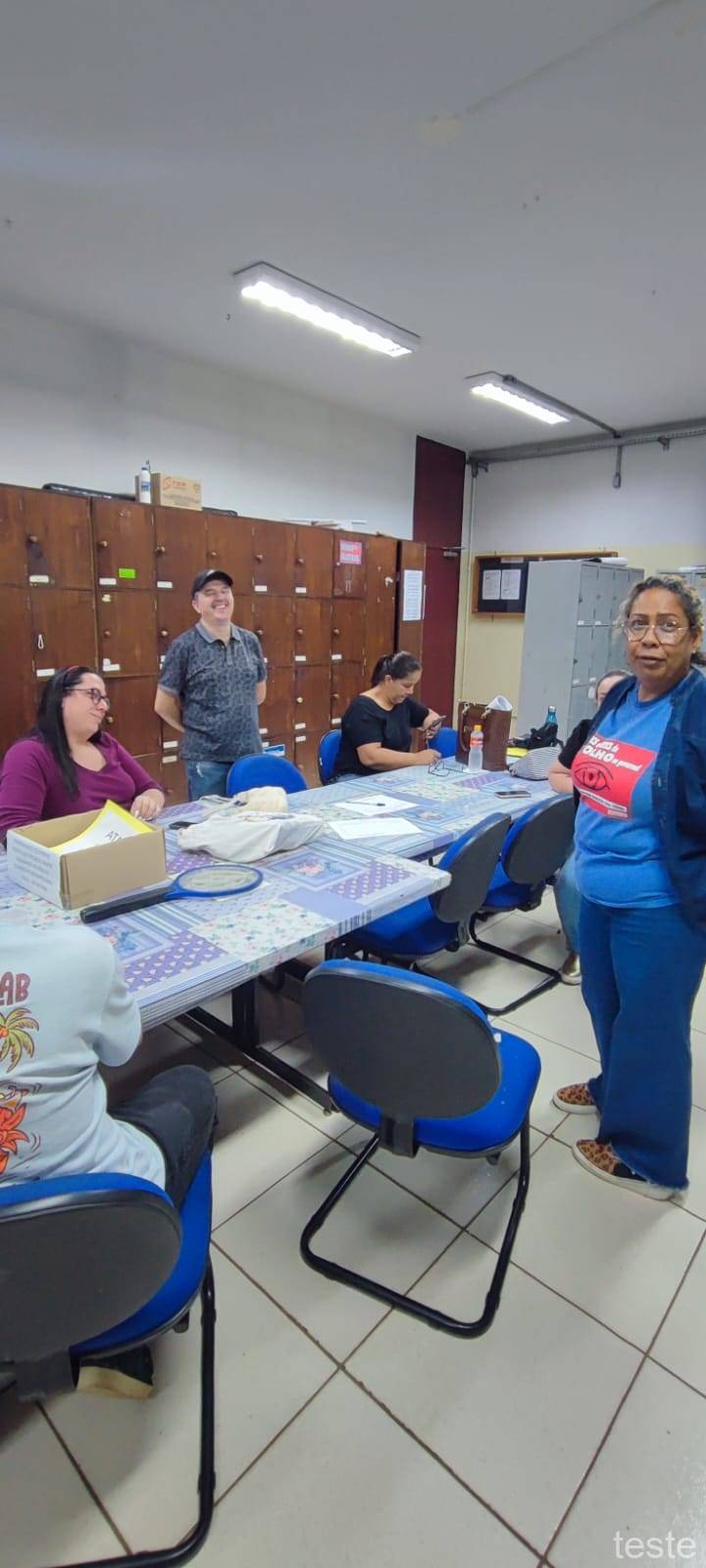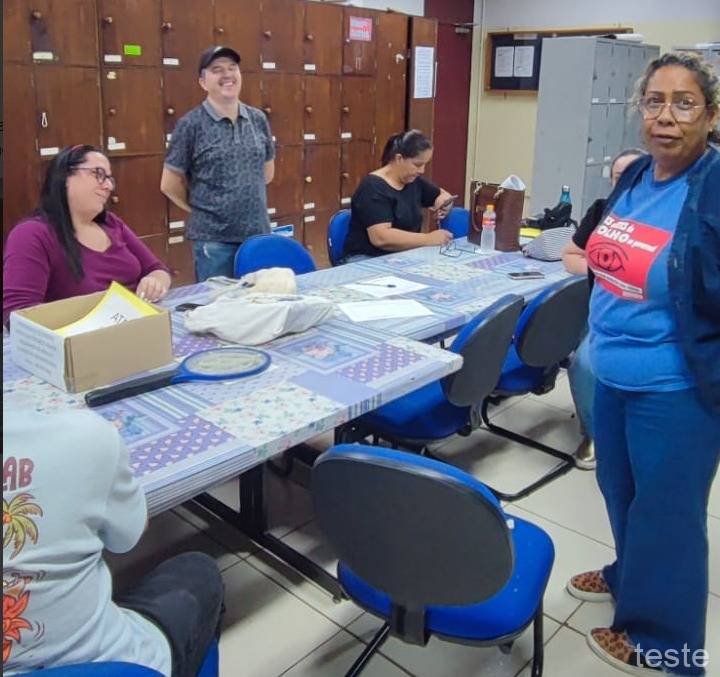 Os diretores do Sinteps Miquéias Ferreira de Oliveira e Margarete Maria Moisés Angeli, em visita à ETEC Elias Nechar, em Catanduva, em 5/11/2024, conversando com os trabalhadores a respeito da greve e esclarecendo outras dúvidas.