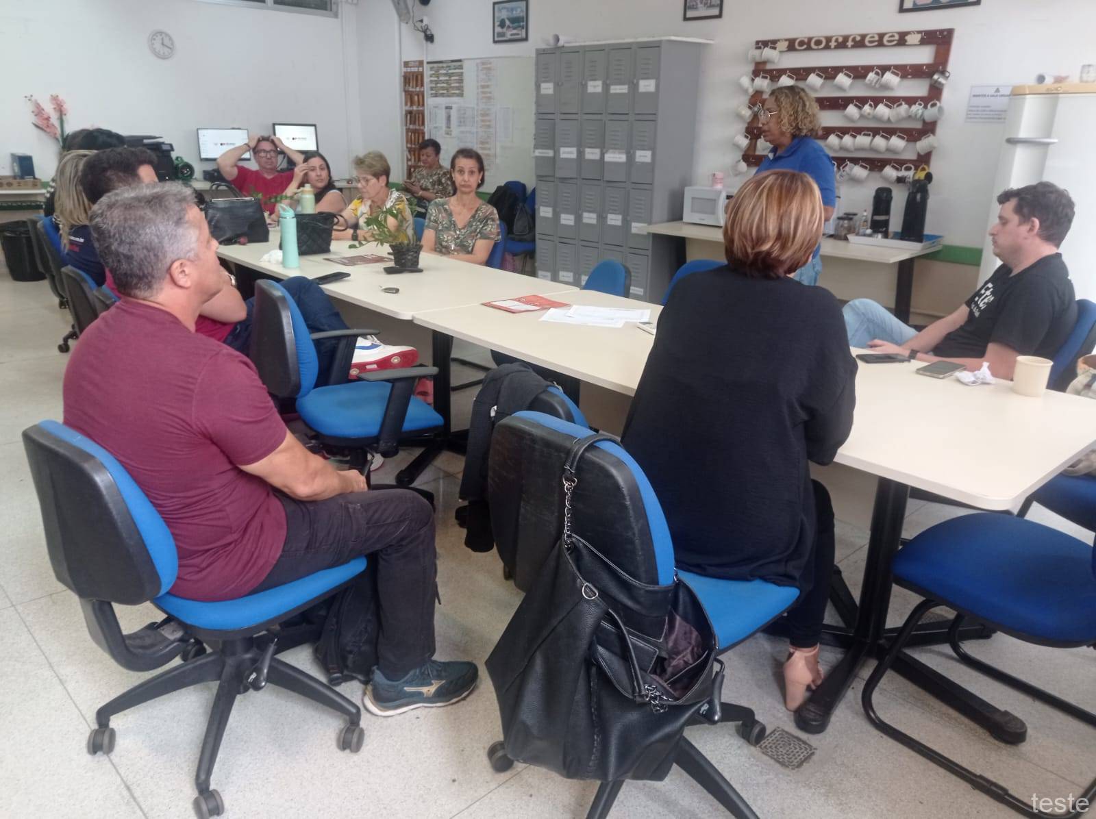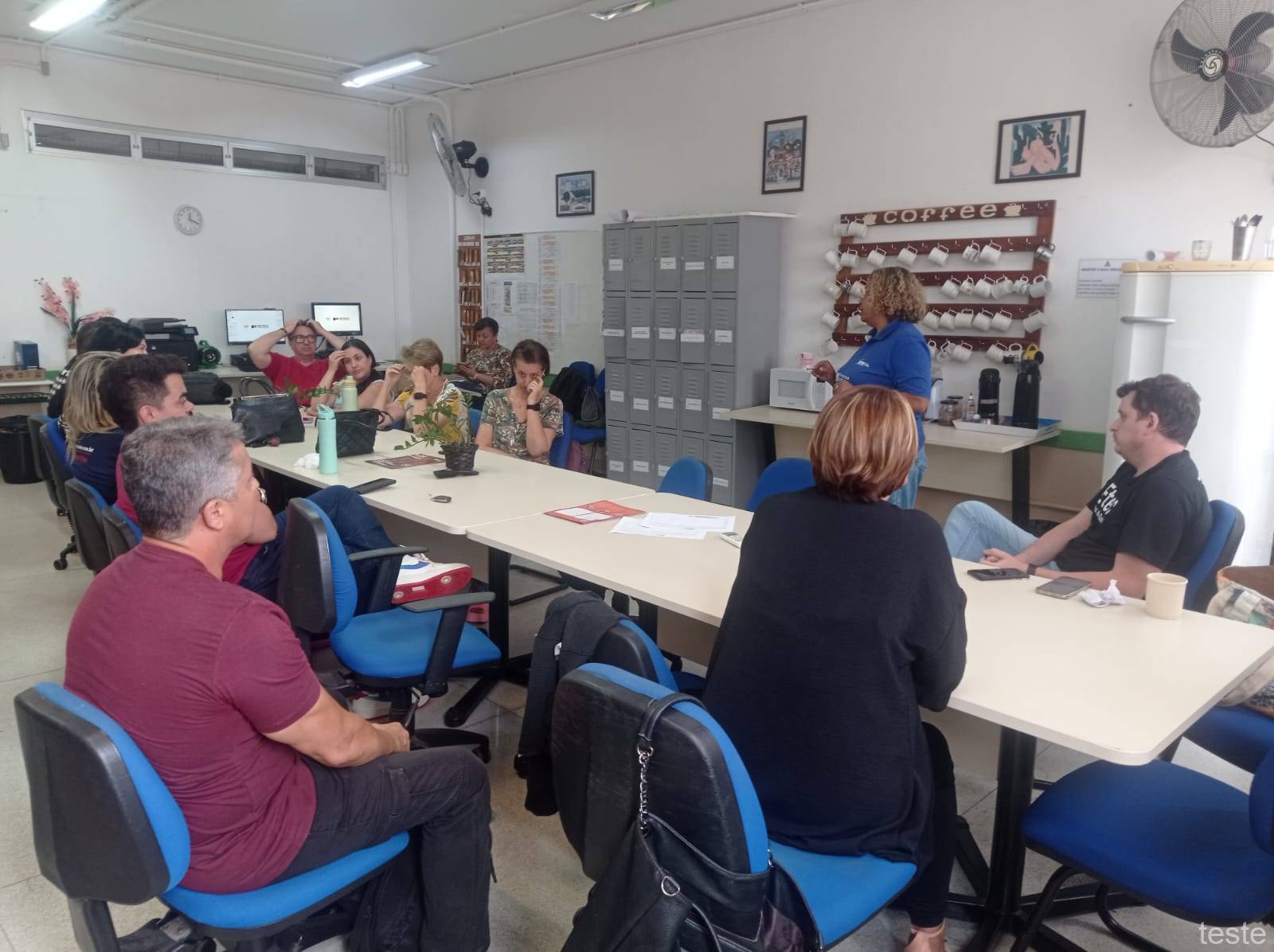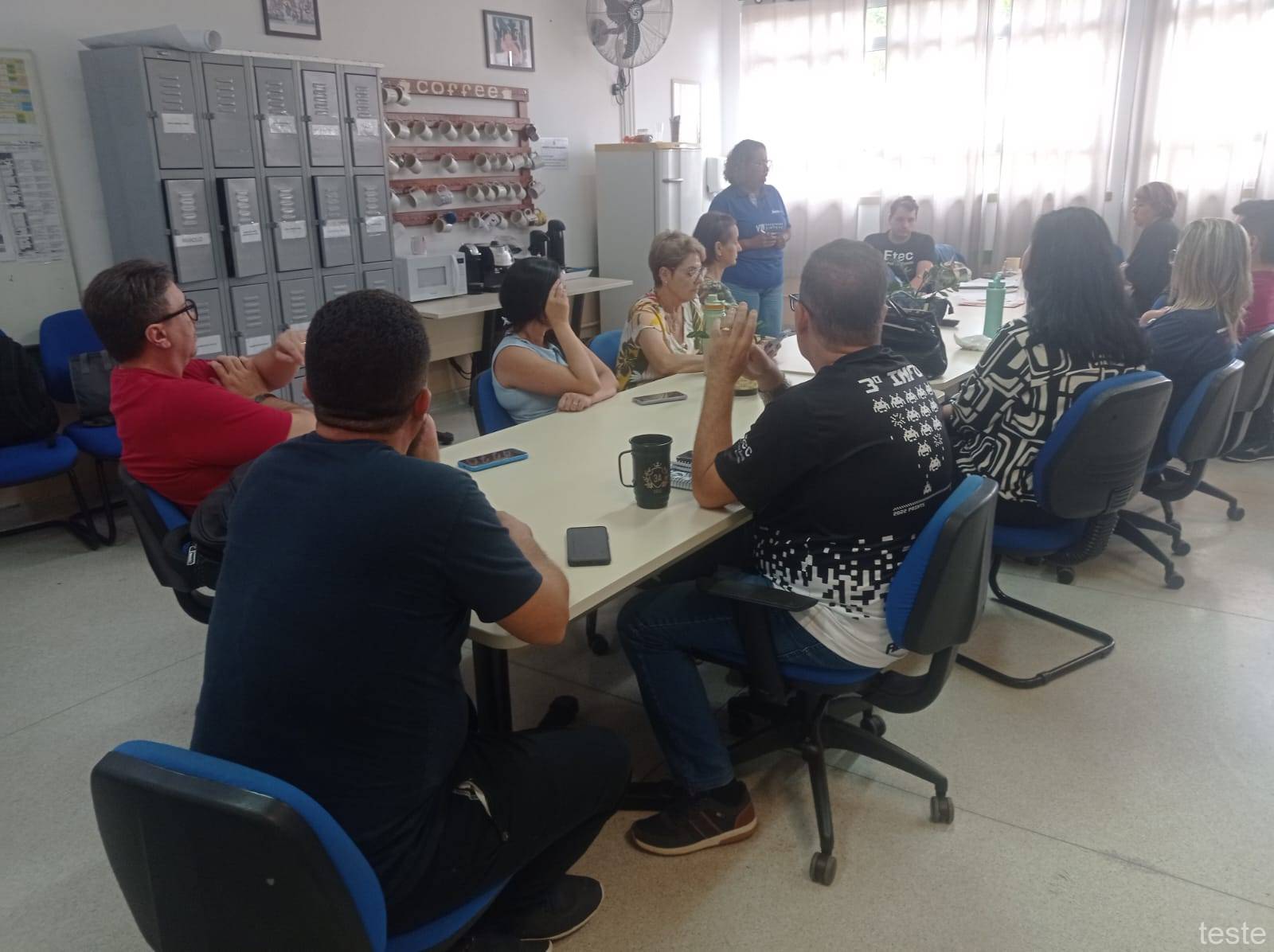 Os diretores do Sinteps Renato Facchin e Margarete Maria Moisés Angeli, em visita à ETEC Professor Idio Zucchi, em Bebedouro, em 6/11/2024, conversando com os trabalhadores a respeito da greve e esclarecendo outras dúvidas.
