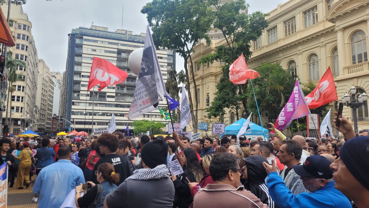 Sinteps presente na manifestação organizada pela Apeoesp, na capital, em 17/12/2025, contra os ataques de Tarcísio e Feder à educação pública paulista. Essa luta também é nossa!