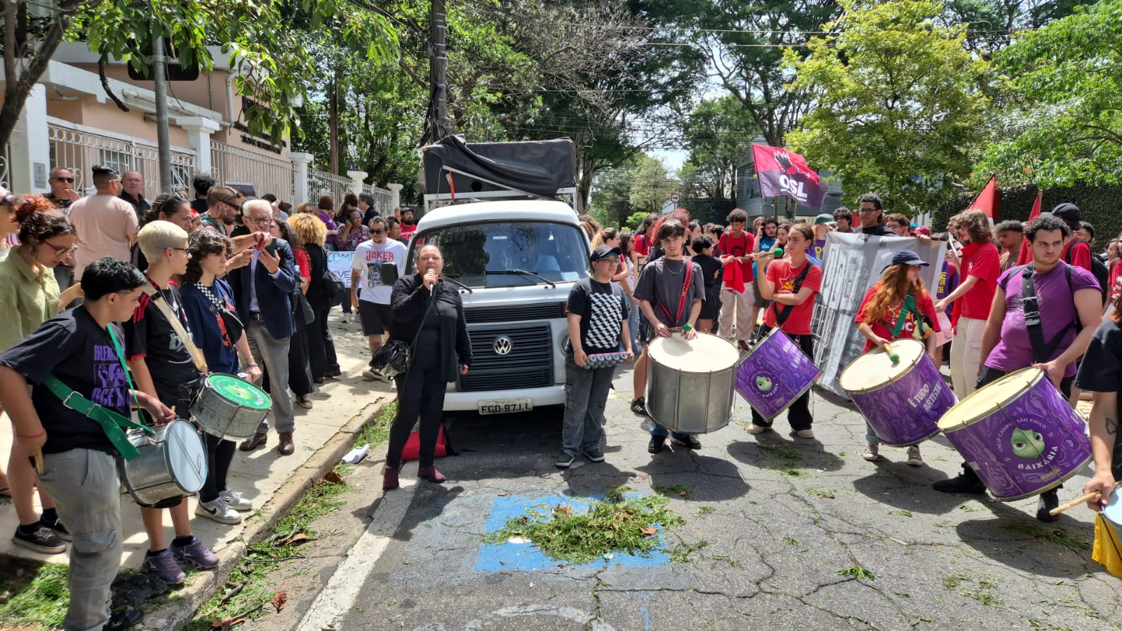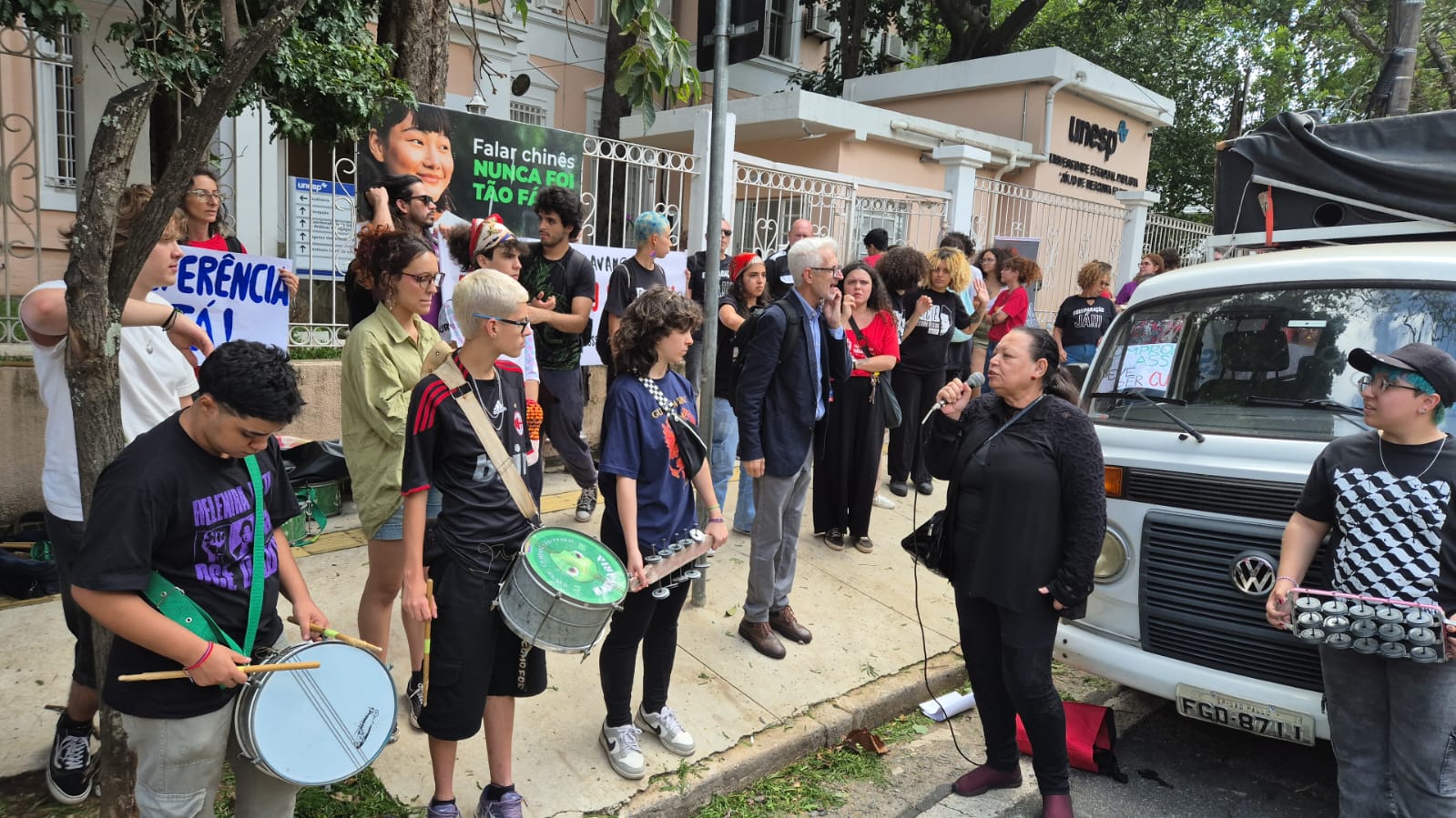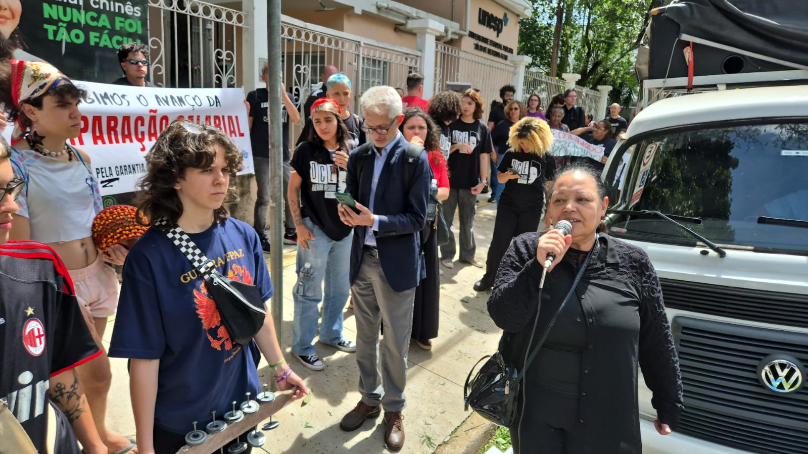 Sinteps presente no ato dos servidores técnico-administrativos da Unesp, em 10/12, durante sessão do Conselho Universitário, em SP. Denise Rykala fala em apoio às reivindicações da categoria.