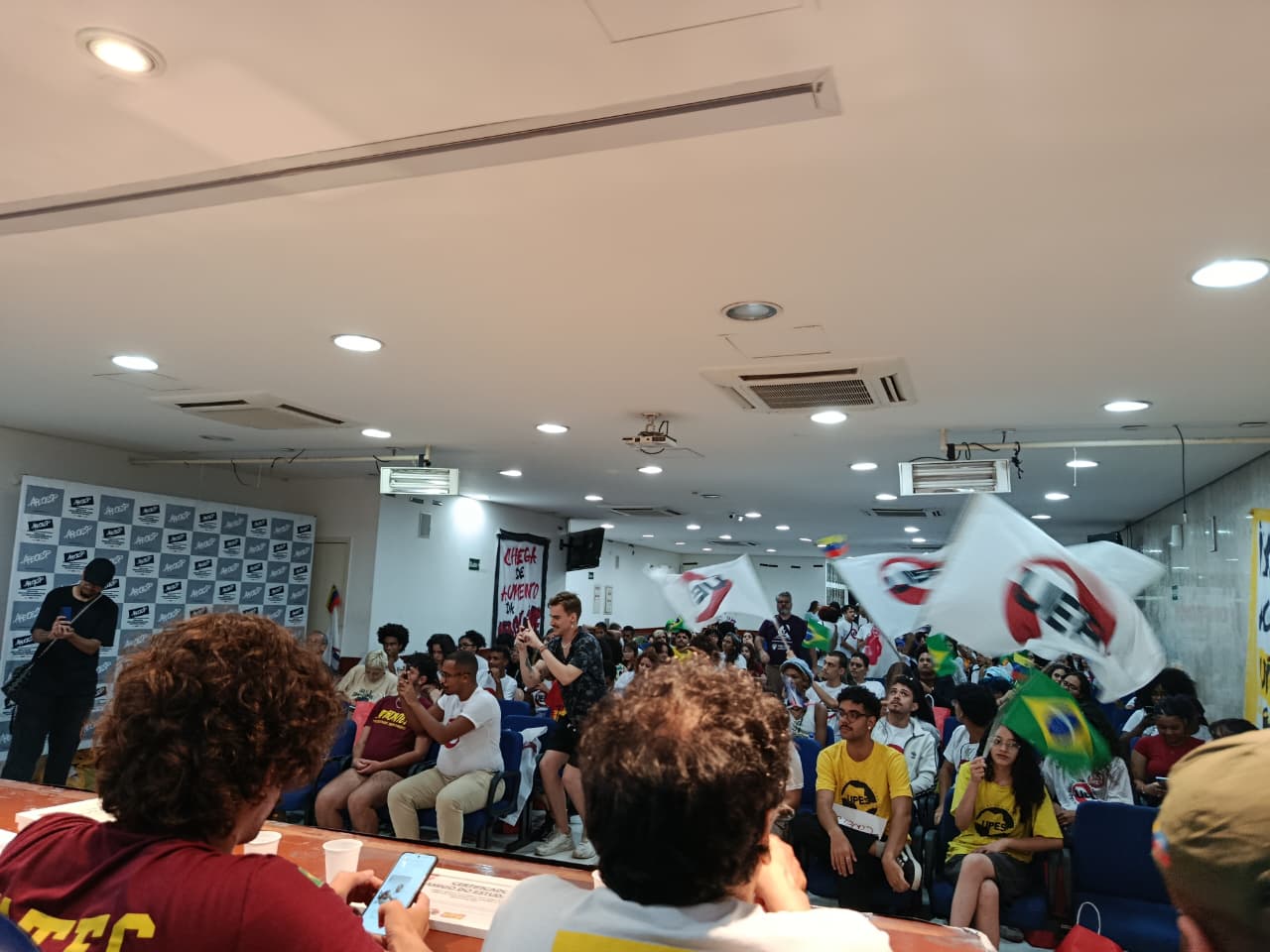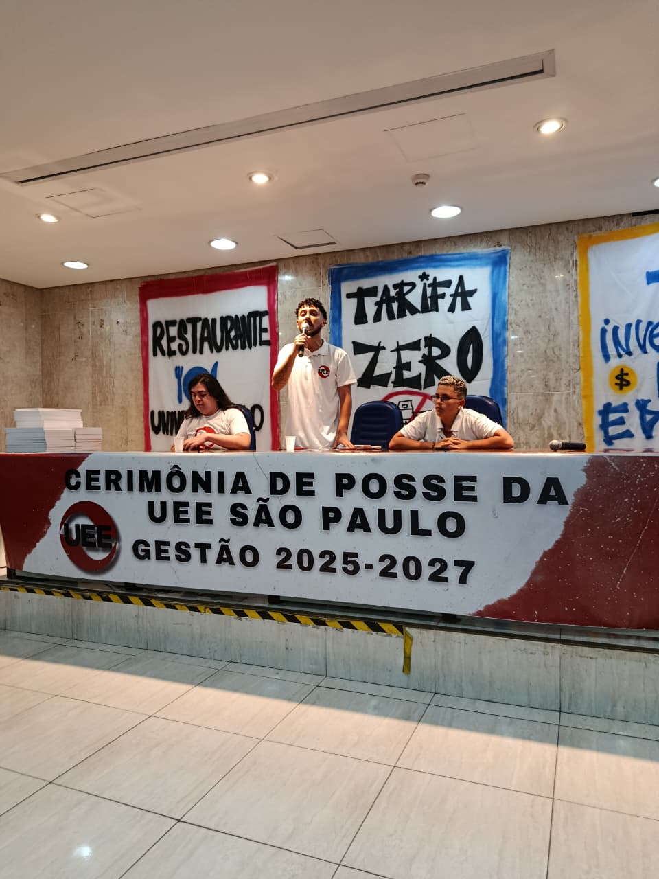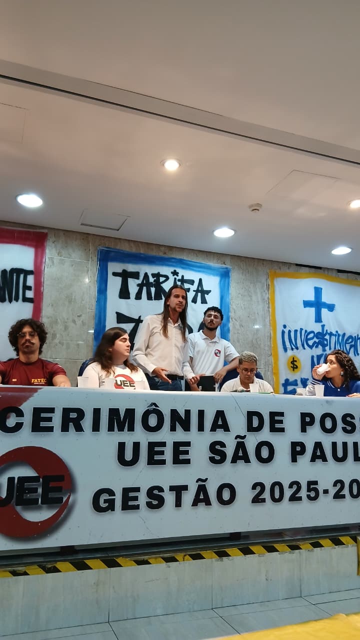 Sinteps presente na cerimônia de posse da nova direção da União Estadual dos Estudantes (UEE-SP), gestão 2025-2027, que ocorreu em 8/2. Felipe Chadi representou o Sindicato e destacou a importância da unidade na luta entre os trabalhadores do Centro e os estudantes.