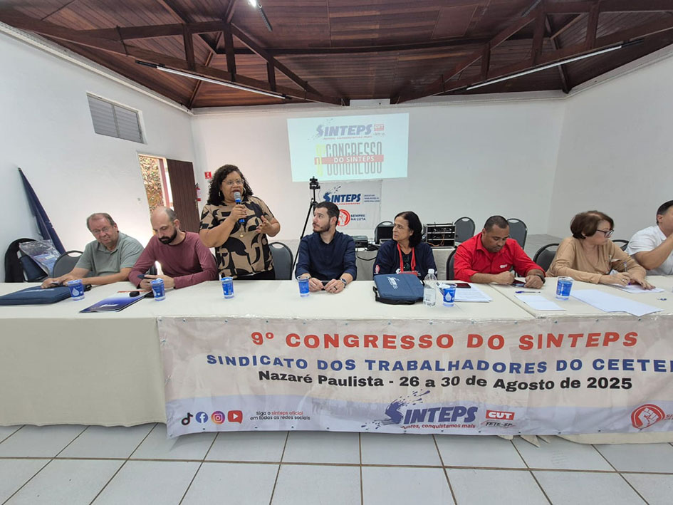 Nilcea Fleury, presidente da Federação Estadual dos Trabalhadores na Educação Pública no Estado de SP (FETE-SP), comentou os muitos ataques do governo Tarcísio à educação – como a redução dos investimentos na educação pública, a plataformização, a militarização das escolas estaduais e os baixos salários. “Aqui neste congresso vocês estão plantando novas sementes, que vão desabrochar em lutas e conquistas para os trabalhadores e os estudantes”, projetou.
