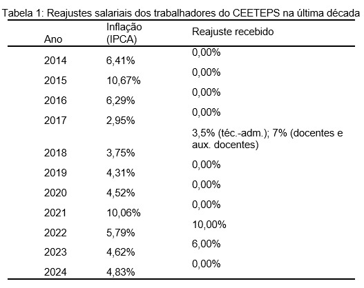Como mostra o quadro abaixo, de 2014 a 2024, houve reajuste salarial somente em dois anos (2018 e 2023). Queremos negociar um plano de reposição destas perdas, o que é fundamental para manter o quadro de servidores atuais e atrair novos talentos para o Centro.